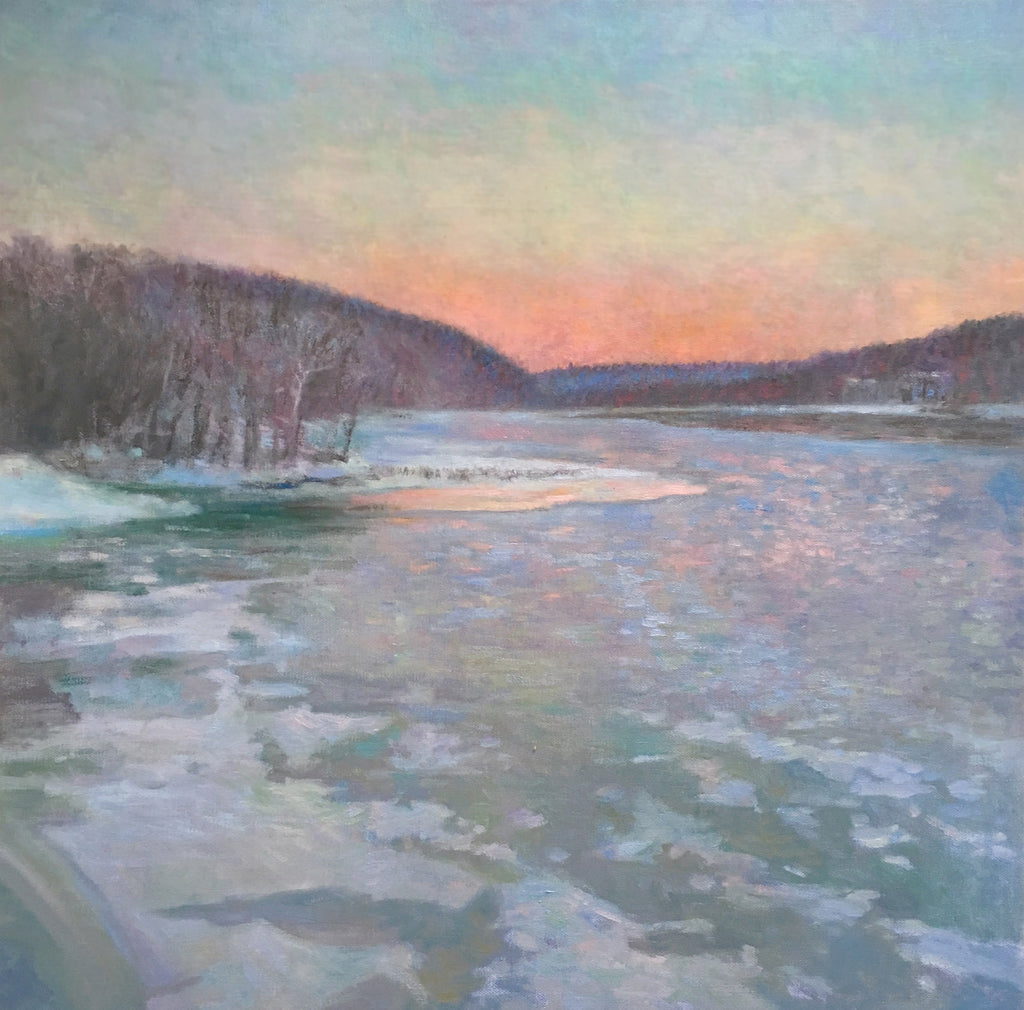 Original 24"x24"x1.25" unframed oil painting on canvas of the Delaware river viewed from the New Hope - Lambertville Bridge by James McPhillips. The canvas is 1.25" deep and could hang unframed.