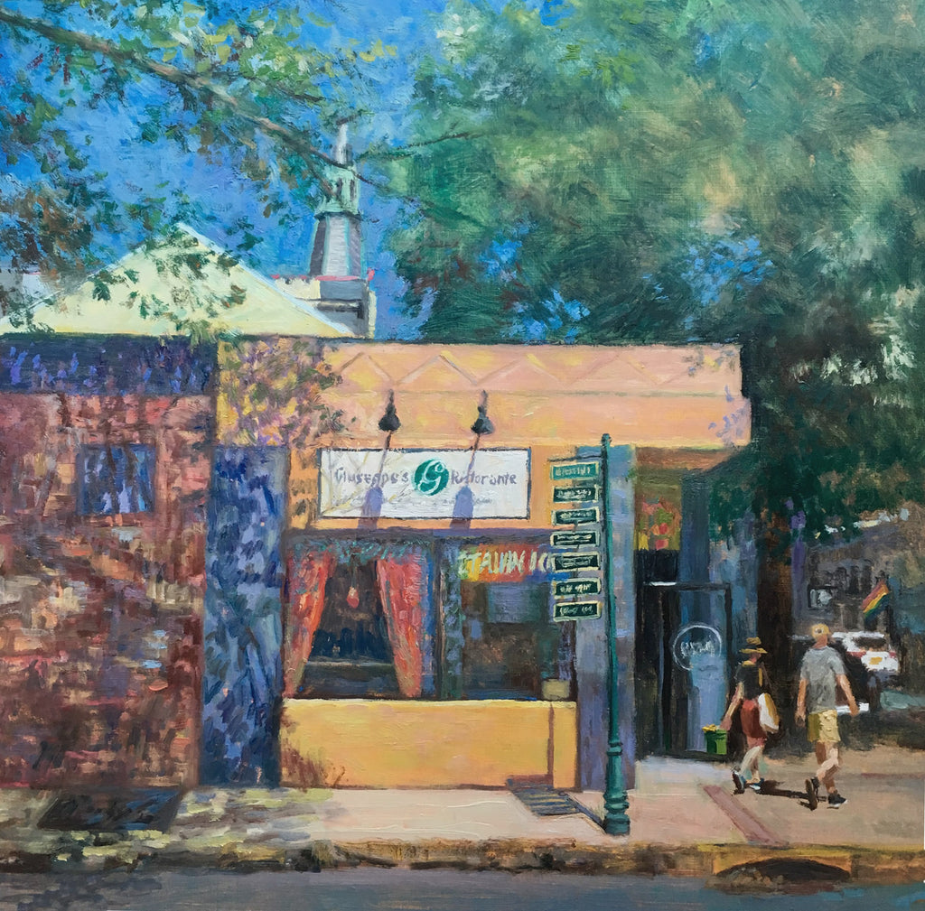 Original 16"x16"x3/16" unframed oil painting on panel of Giuseppe's Ristorante in Lambertville, NJ by James McPhillips.